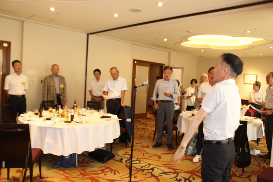 ここで議事は終了し、しばし休憩し、12時30分、懇親会に移った、司会は菊地健男副会長(33回)に代わり、乾杯の音頭を今井守夫副会長(25回)が行い、食事となった。食後、出席者銘々の自己紹介がった。一人1分ということであったが、長い1分もあった。全員の現況、抱負を聞けたことは幸いであった。現役の激しい要職対応のことやお孫さんが生まれたことなども紹介された。2時25分、恒例の校歌斉唱となり、菊地元栃木県立大田原高等学校応援団員が指揮を執った。締まりがあった。